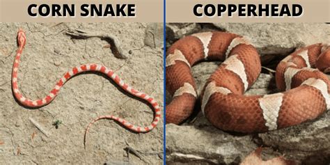 Corn snakes are typically red, orange, or yellow in color with black or brown stripes running along their bodies. They usually have a light tan or yellow belly. Copperheads, on the other hand, have a distinct pattern of brown, black, and tan scales with a pinkish-tan belly. They are usually less than four feet long and have a wide, triangular head.